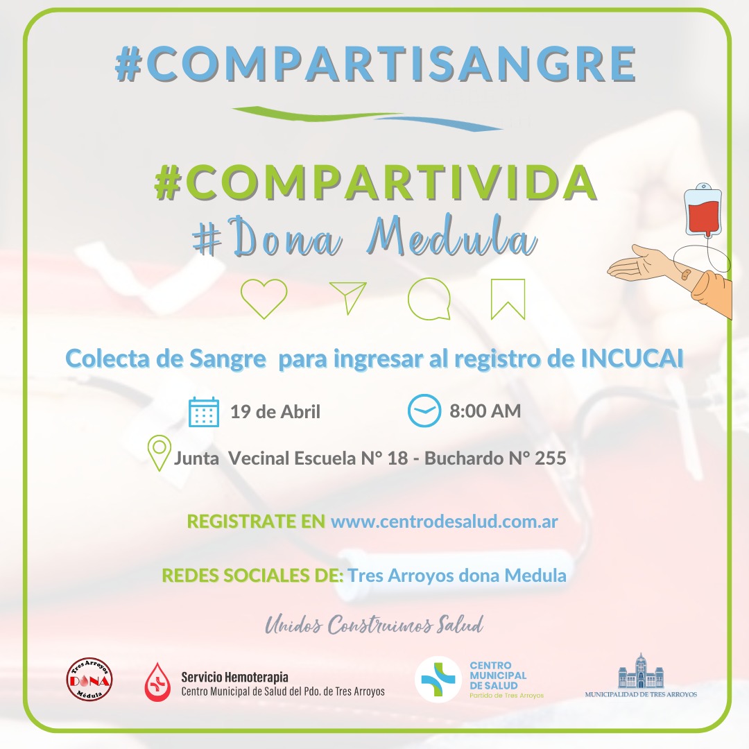 Organizan: Tres Arroyos Dona Medula y nuestro Servicio de Hemoterapia del Centro Municipal de Salud. Colabora: Junta Vecinal Escuela N° 18.